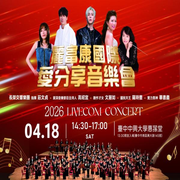 - 麗富康是熱情分享、實踐理想的生技通路事業, 我們希望藉由愛分享音樂會, 分享對生活的喜愛、對生命的熱愛, 最感動人心的音樂會,用最高規格的等級, 分享給最親愛的麗富康家人夥伴們! 創作才女-文慧如 國民天王-羅時豐 實力男神-畢書盡 榮交響樂團 與 莊文貞指揮 資深音樂節目主持人-高劭宜 2026麗富康愛分享音樂會 期待與大家一起共度美好的夜晚! 【活動名稱】2026麗富康國際 愛分享音樂會 【 日 期 】114年4月18日(星期六) 【 時 間 】14:30-15:00(13:30開放入場) 【 地 點 】臺中中興大學惠蓀堂 【 地 址 】臺中市南區國光路250號 • 活動地點 中興大學位置圖 ▶ 2025 麗富康國際愛分享音樂會照片回顧 ▶2025 麗富康國際愛分享音樂會活動花絮
