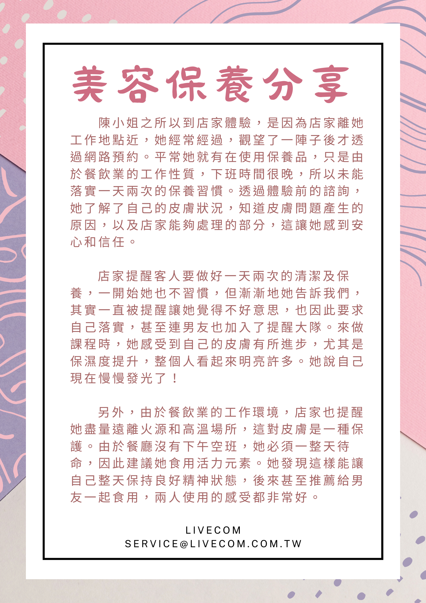 最新消息 榮耀榜 公告 防疫資訊 美容保養分享 活動速遞 宣導海報 新聞紀錄 最新消息 榮耀榜 公告 防疫資訊 美容保養分享 活動速遞 宣導海報 新聞紀錄 美容保養分享 .首頁 > 最新消息 > 美容保養分享 [美容保養分享] 踏出第一步,讓保養成為日常生活|陳小姐 發佈日期:2025-08-06 回上一頁
