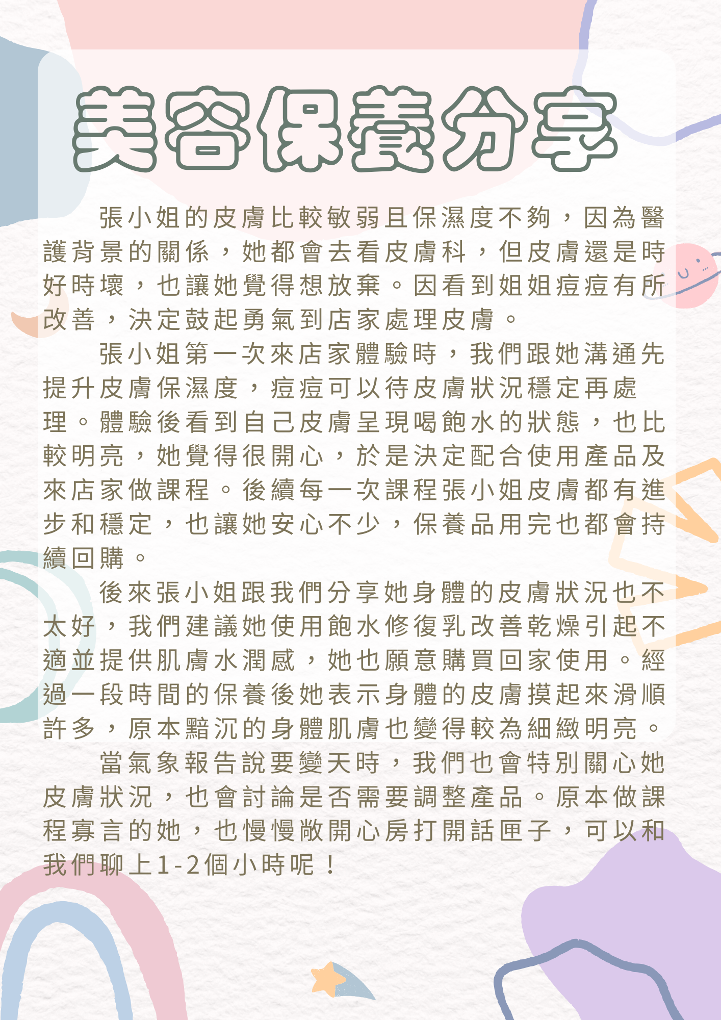 最新消息 榮耀榜 公告 防疫資訊 美容保養分享 活動速遞 宣導海報 新聞紀錄 最新消息 榮耀榜 公告 防疫資訊 美容保養分享 活動速遞 宣導海報 新聞紀錄 美容保養分享 .首頁 > 最新消息 > 美容保養分享 [美容保養分享] 敏弱肌也能穩定,找回肌膚自信與光澤 |張小姐 發佈日期:2025-10-22 回上一頁