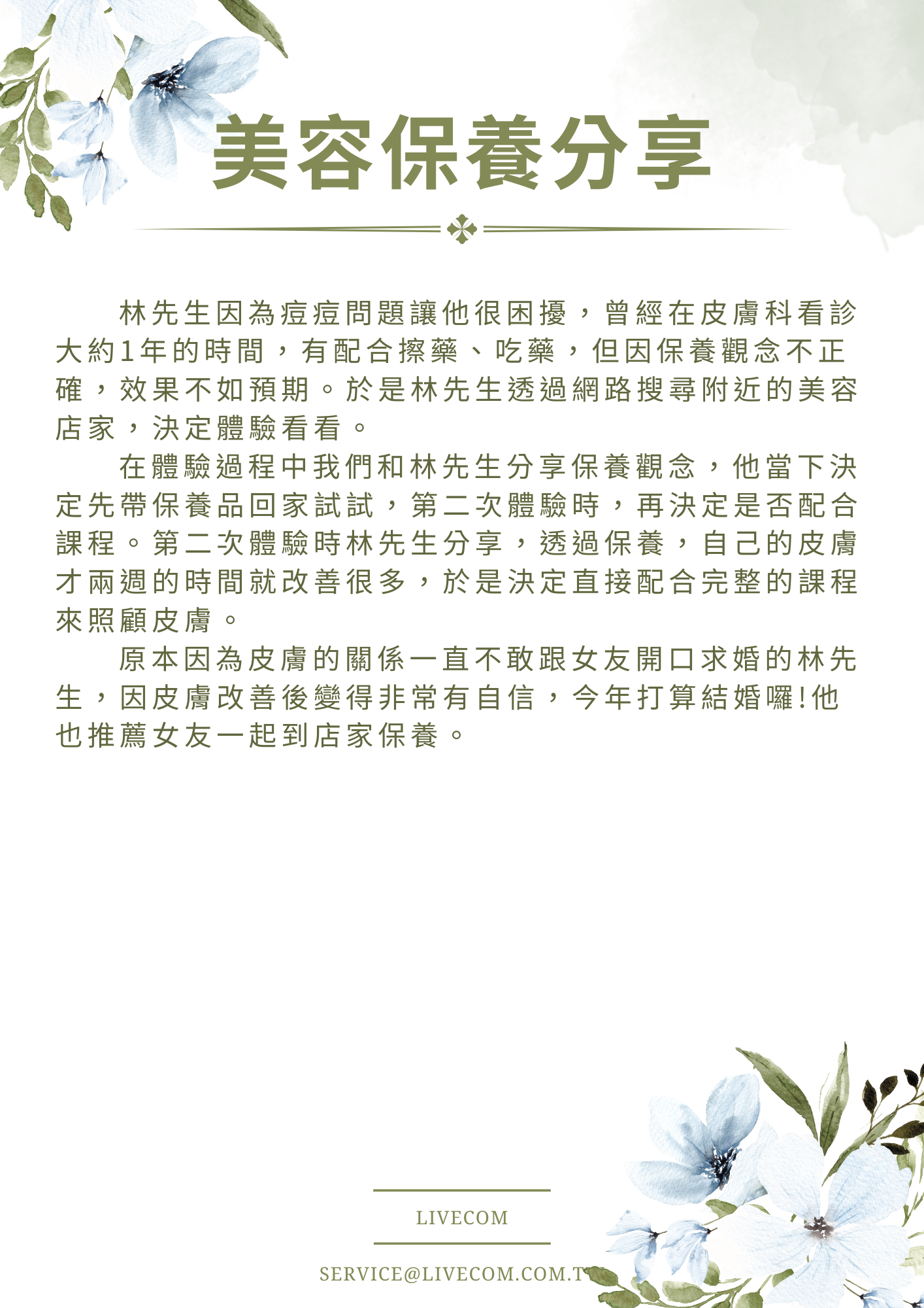 最新消息 榮耀榜 公告 防疫資訊 美容保養分享 活動速遞 宣導海報 新聞紀錄 最新消息 榮耀榜 公告 防疫資訊 美容保養分享 活動速遞 宣導海報 新聞紀錄 美容保養分享 .首頁 > 最新消息 > 美容保養分享 [美容保養分享] 改變從保養開始,幸福從自信開始|林先生 發佈日期:2025-12-10 回上一頁