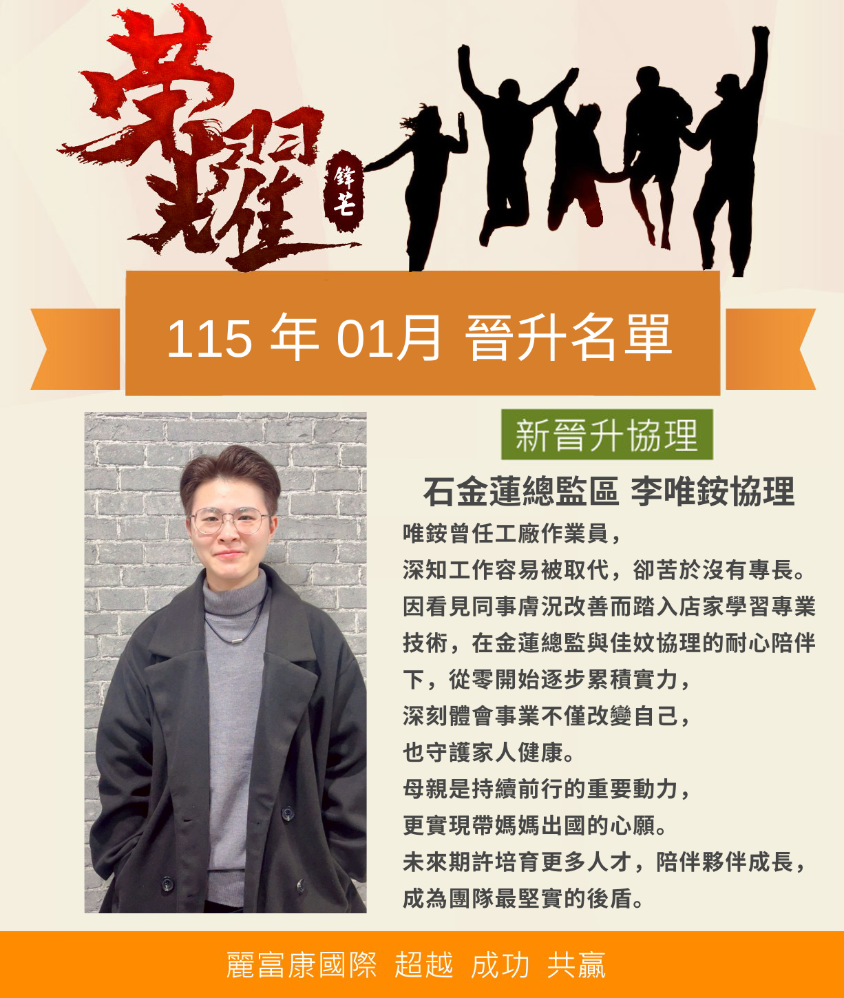 最新消息 榮耀榜 公告 防疫資訊 美容保養分享 活動速遞 宣導海報 新聞紀錄 最新消息 榮耀榜 公告 防疫資訊 美容保養分享 活動速遞 宣導海報 新聞紀錄 榮耀榜 .首頁 > 最新消息 > 榮耀榜 [公告] 115年01月新晉升高階名單 發佈日期:2026-01-12 回上一頁