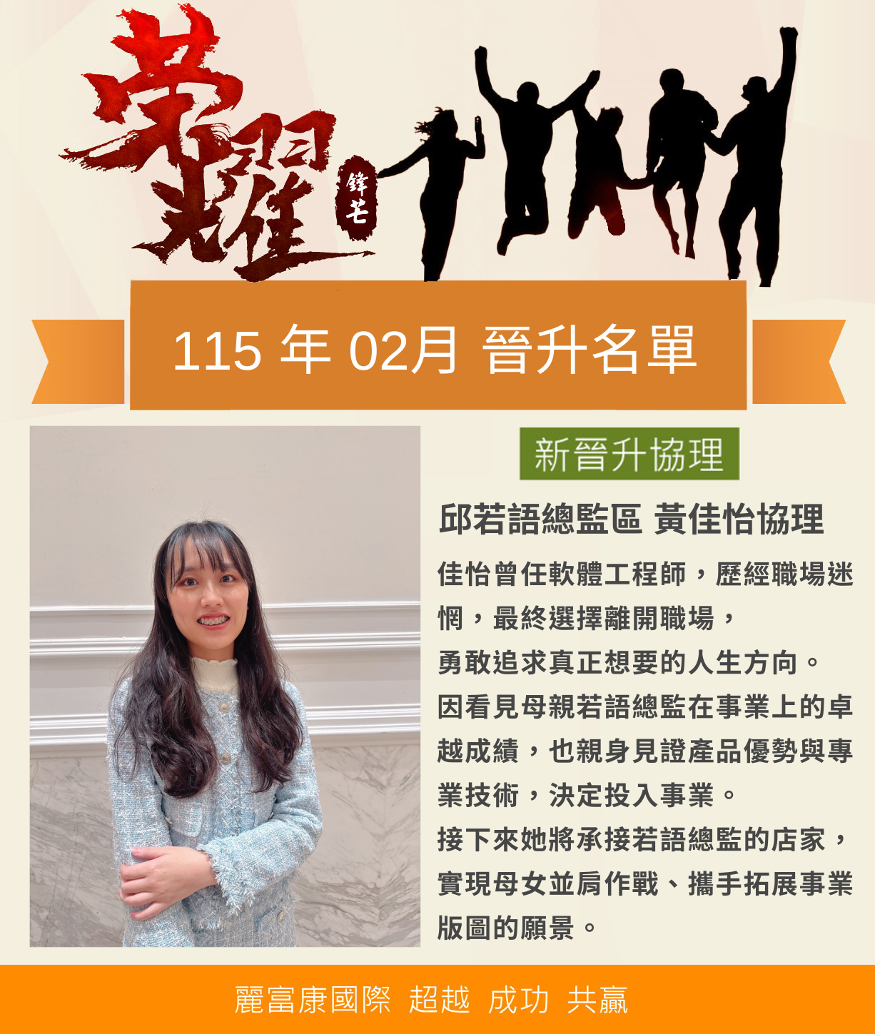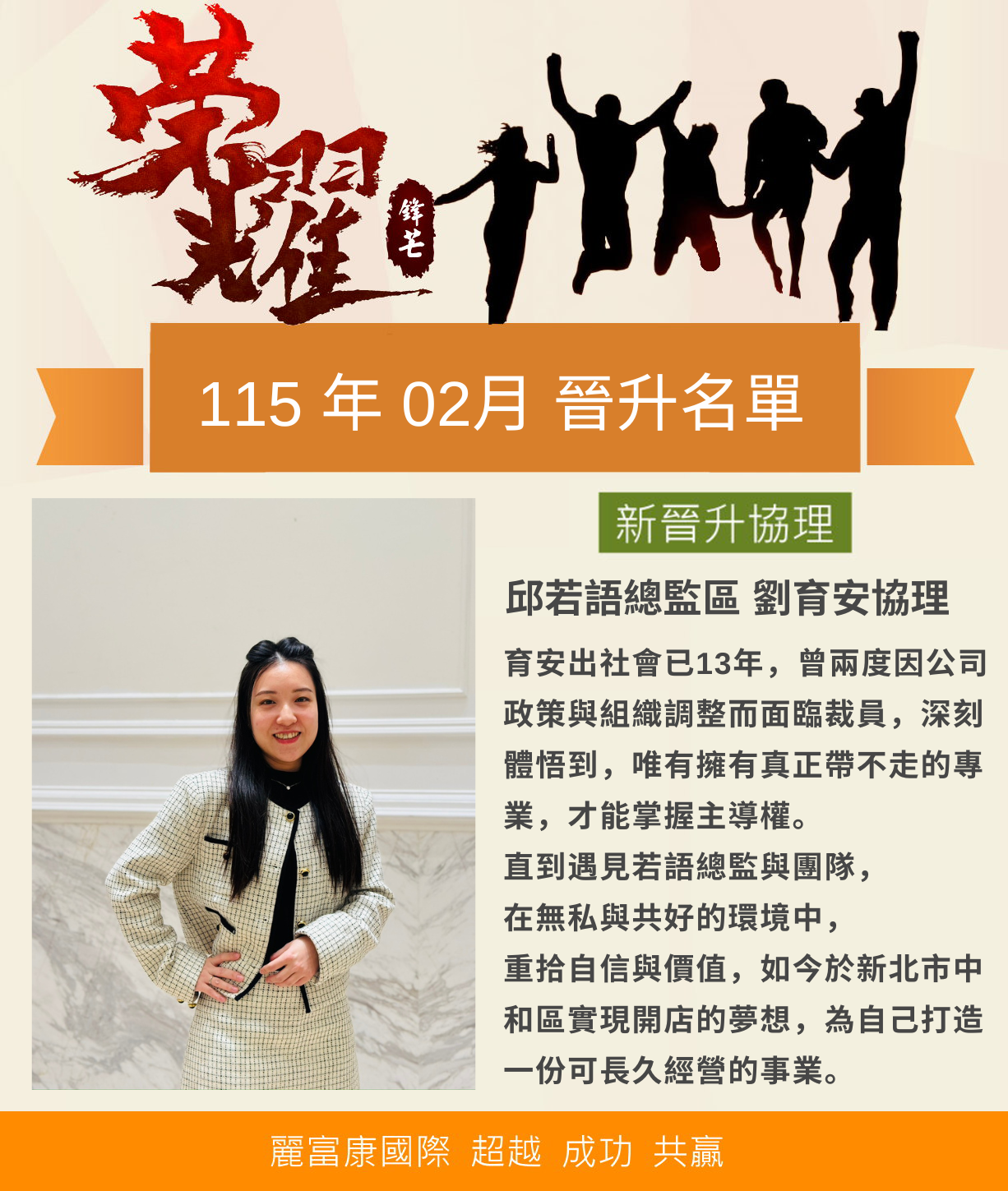 最新消息 榮耀榜 公告 防疫資訊 美容保養分享 活動速遞 宣導海報 新聞紀錄 最新消息 榮耀榜 公告 防疫資訊 美容保養分享 活動速遞 宣導海報 新聞紀錄 榮耀榜 .首頁 > 最新消息 > 榮耀榜 [公告] 115年02月新晉升高階名單 發佈日期:2026-02-09 回上一頁