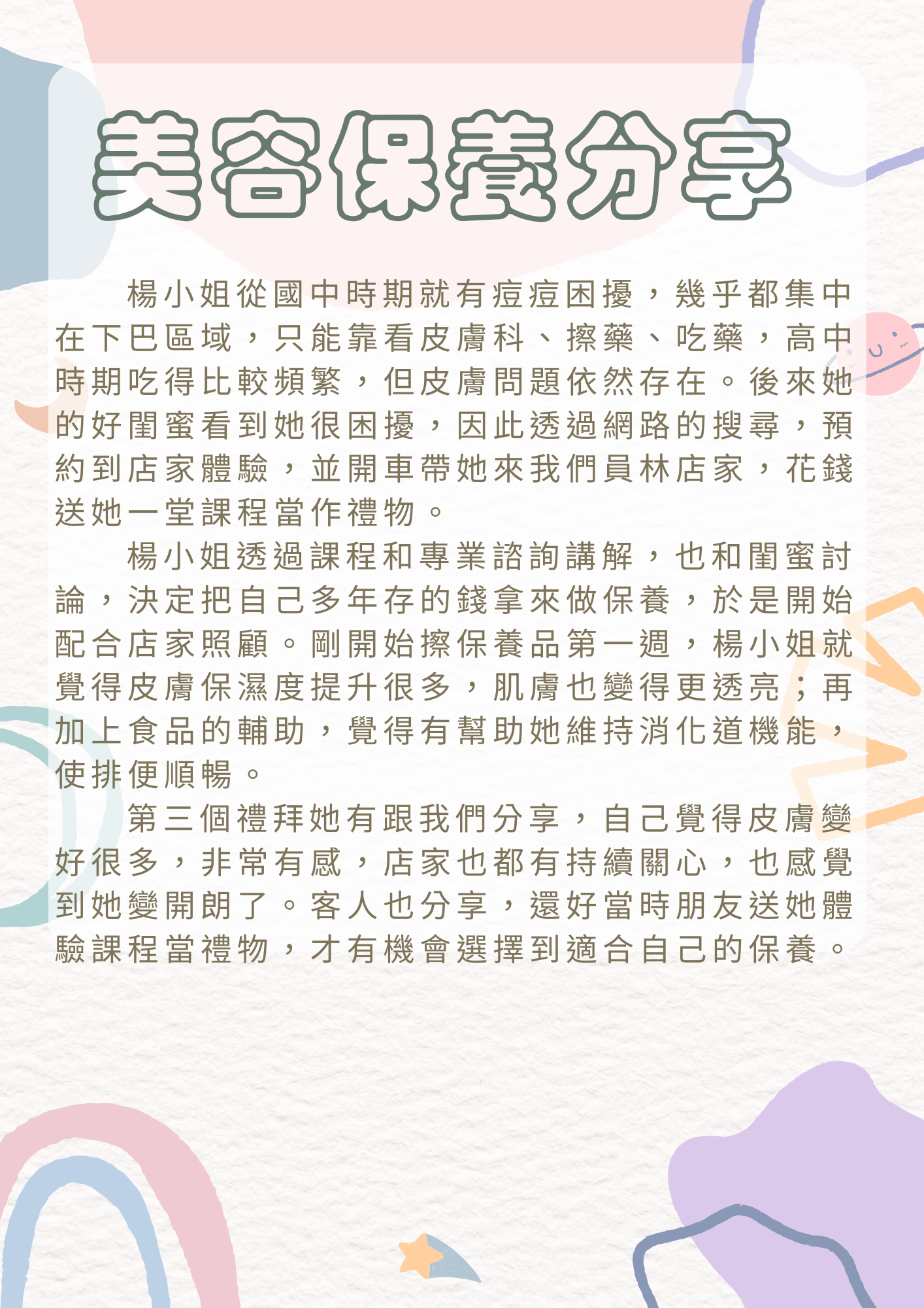 最新消息 榮耀榜 公告 防疫資訊 美容保養分享 活動速遞 宣導海報 新聞紀錄 最新消息 榮耀榜 公告 防疫資訊 美容保養分享 活動速遞 宣導海報 新聞紀錄 美容保養分享 .首頁 > 最新消息 > 美容保養分享 [美容保養分享] 朋友的一份貼心禮物,找回健康肌膚與自信笑容|楊小姐 發佈日期:2025-10-01 回上一頁