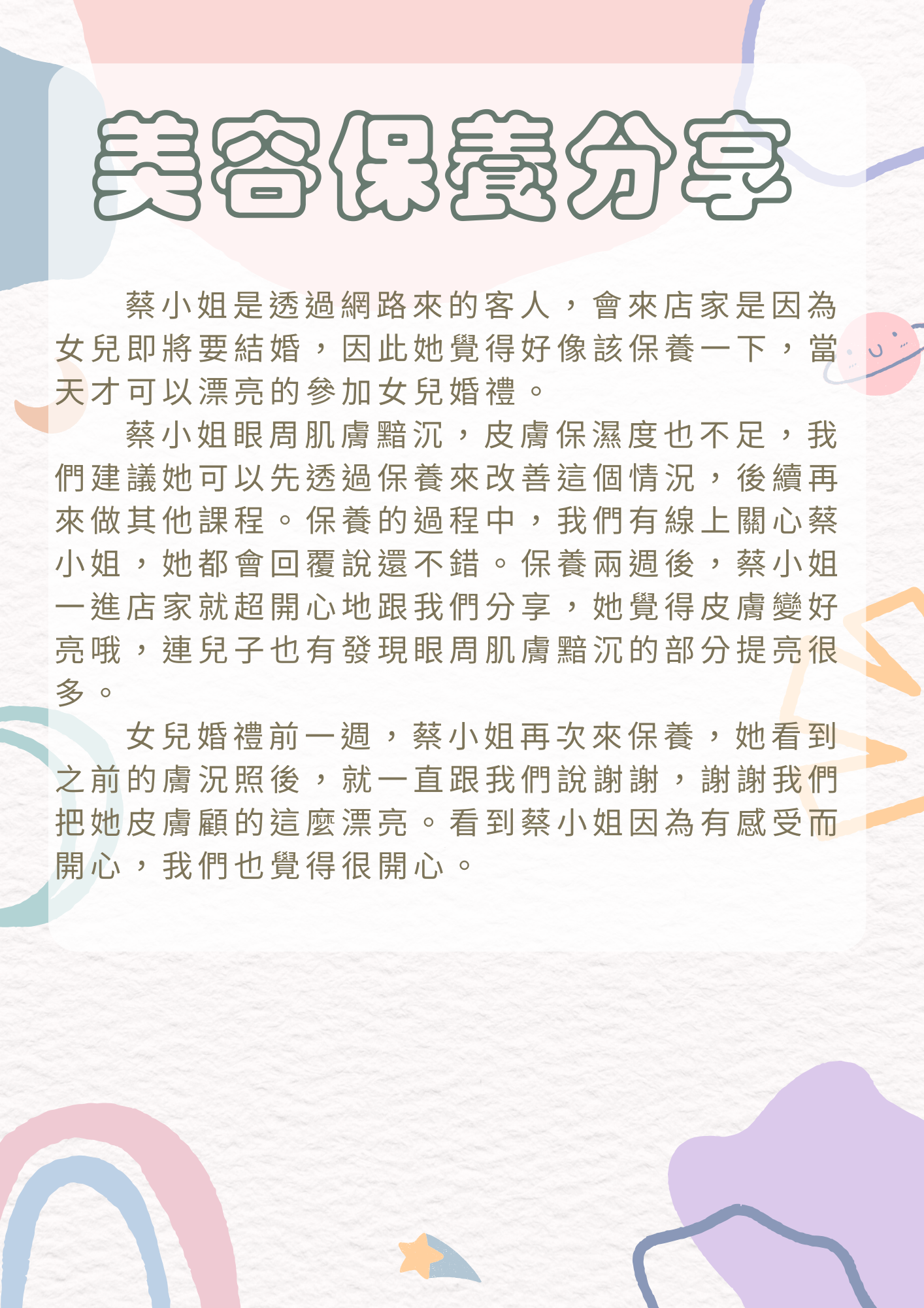 最新消息 榮耀榜 公告 防疫資訊 美容保養分享 活動速遞 宣導海報 新聞紀錄 最新消息 榮耀榜 公告 防疫資訊 美容保養分享 活動速遞 宣導海報 新聞紀錄 美容保養分享 .首頁 > 最新消息 > 美容保養分享 [美容保養分享] 婚禮前,她選擇好好呵護自己,成為最美的媽媽|蔡小姐 發佈日期:2025-10-15 回上一頁