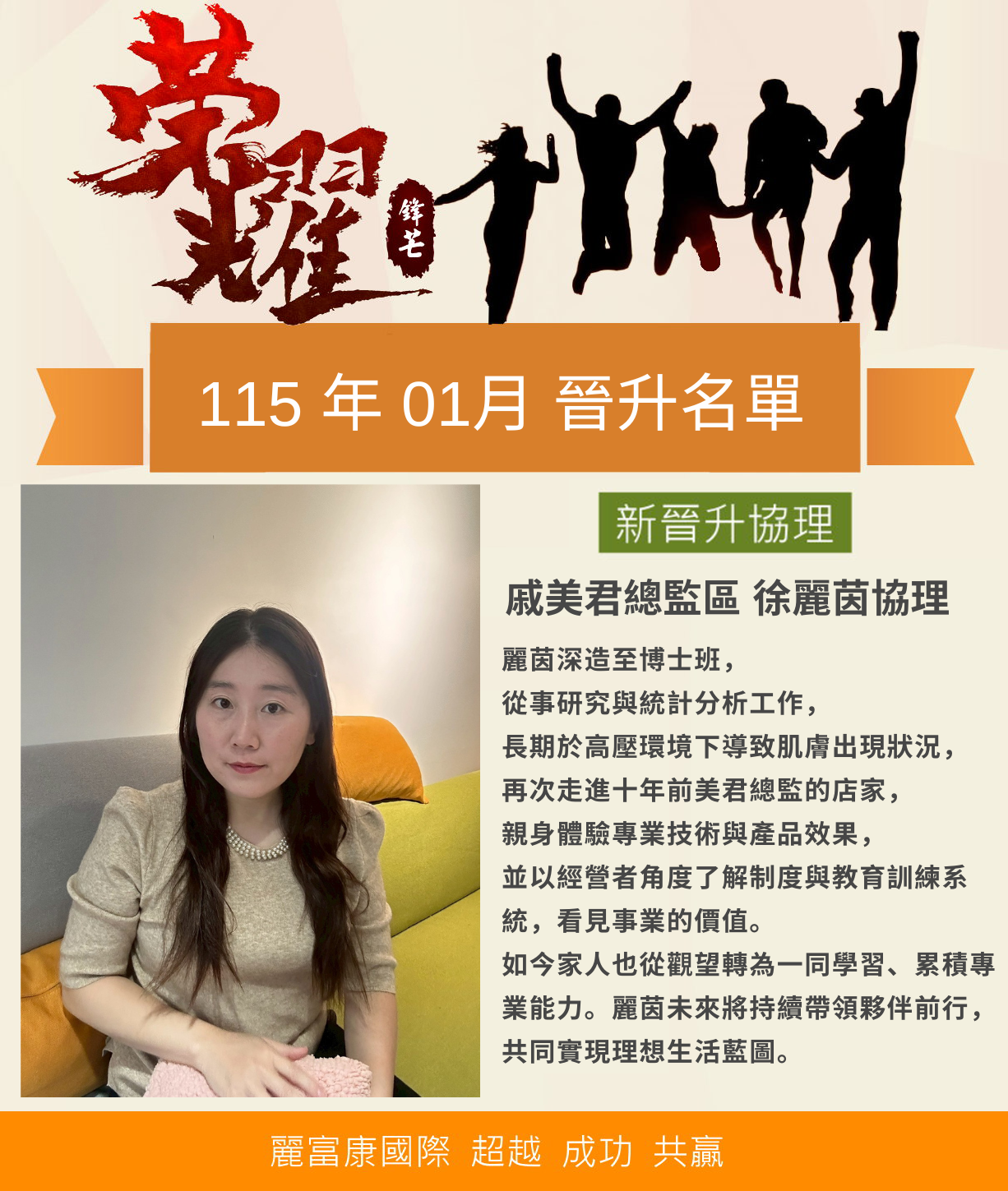 最新消息 榮耀榜 公告 防疫資訊 美容保養分享 活動速遞 宣導海報 新聞紀錄 最新消息 榮耀榜 公告 防疫資訊 美容保養分享 活動速遞 宣導海報 新聞紀錄 榮耀榜 .首頁 > 最新消息 > 榮耀榜 [公告] 115年01月新晉升高階名單 發佈日期:2026-01-12 回上一頁